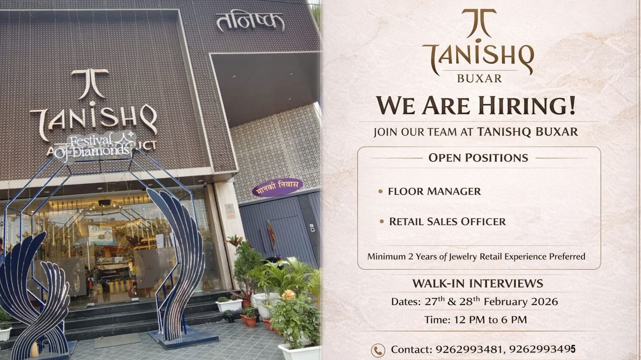 बक्सर। देश के प्रतिष्ठित आभूषण ब्रांड Tanishq के बक्सर शोरूम में ज्वेलरी रिटेल क्षेत्र से जुड़े अनुभवी युवाओं के लिए रोजगार का सुनहरा अवसर सामने आया है। शोरूम प्रबंधन ने टीम विस्तार के तहत योग्य और ऊर्जावान प्रोफेशनल्स की भर्ती प्रक्रिया शुरू करने की घोषणा की है।
