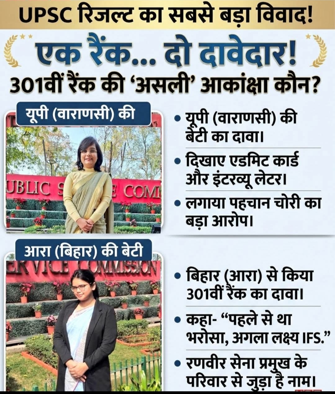 जानकारी के अनुसार, उत्तर प्रदेश के वाराणसी की रहने वाली आकांक्षा सिंह ने 301वीं रैंक पर अपना दावा करते हुए कहा है कि उनके पास UPSC का एडमिट कार्ड और इंटरव्यू लेटर मौजूद है, जिससे यह साबित होता है कि यह रैंक उन्हीं की है। उनका आरोप है कि बिहार के आरा की रहने वाली एक लड़की उनकी पहचान का इस्तेमाल कर रही है और उसी आधार पर खुद को 301वीं रैंक हासिल करने वाली बता रही है।